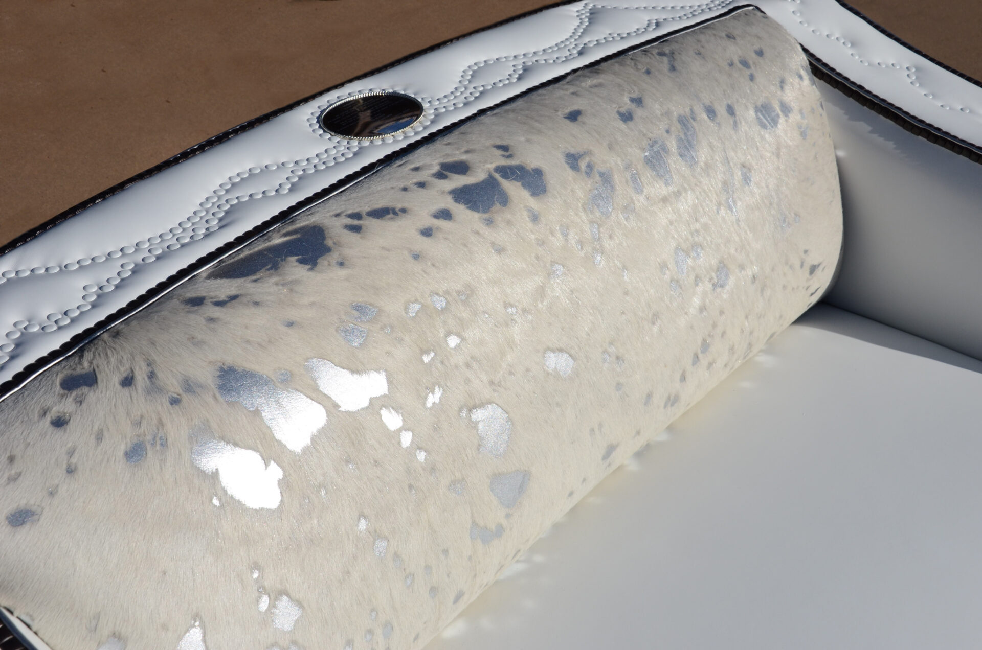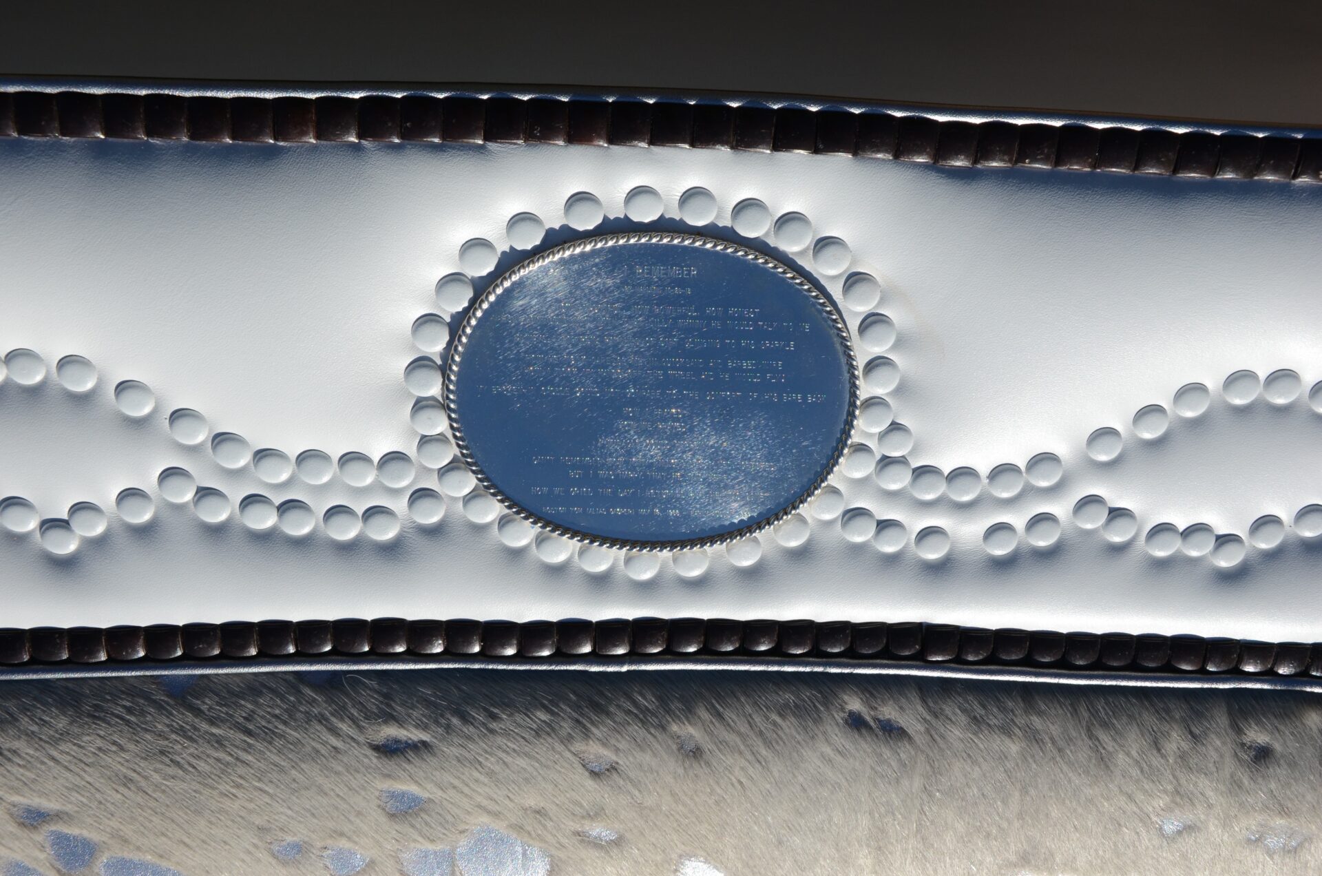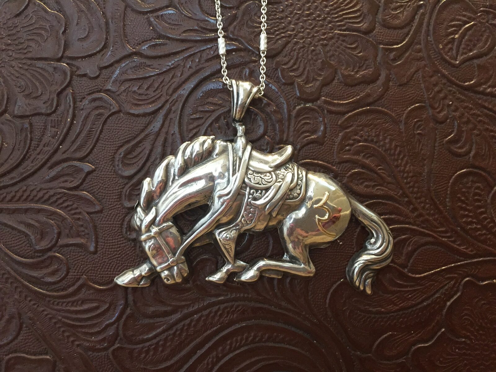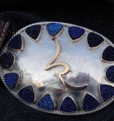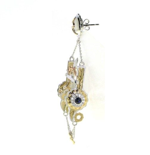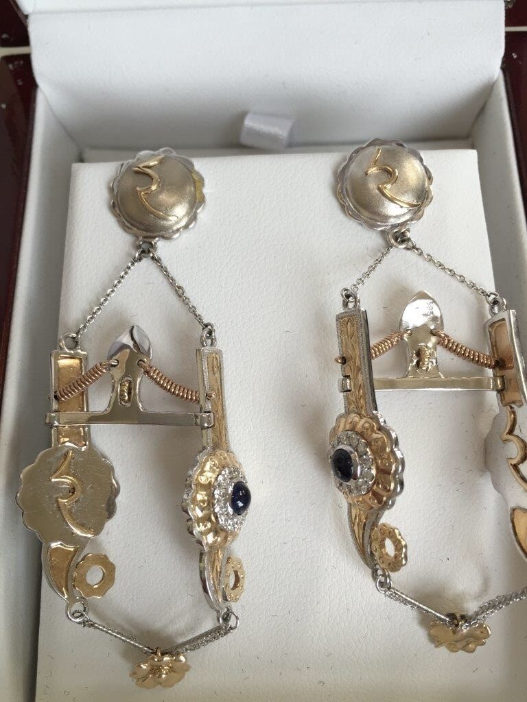 Truly one of a kind, there’s nothing like them anywhere! The Annamarie Spanish bit earrings (named after my mother, a true equestrian) are working replicas of a functioning bit, with a rotating cricket and moving shanks. Shown are in yellow, white and rose gold with Sapphires and diamonds with your selection of any gems or stones. Your ranch brand can be incorporated in the design. A similar, but smaller sterling silver earring design is also available.
