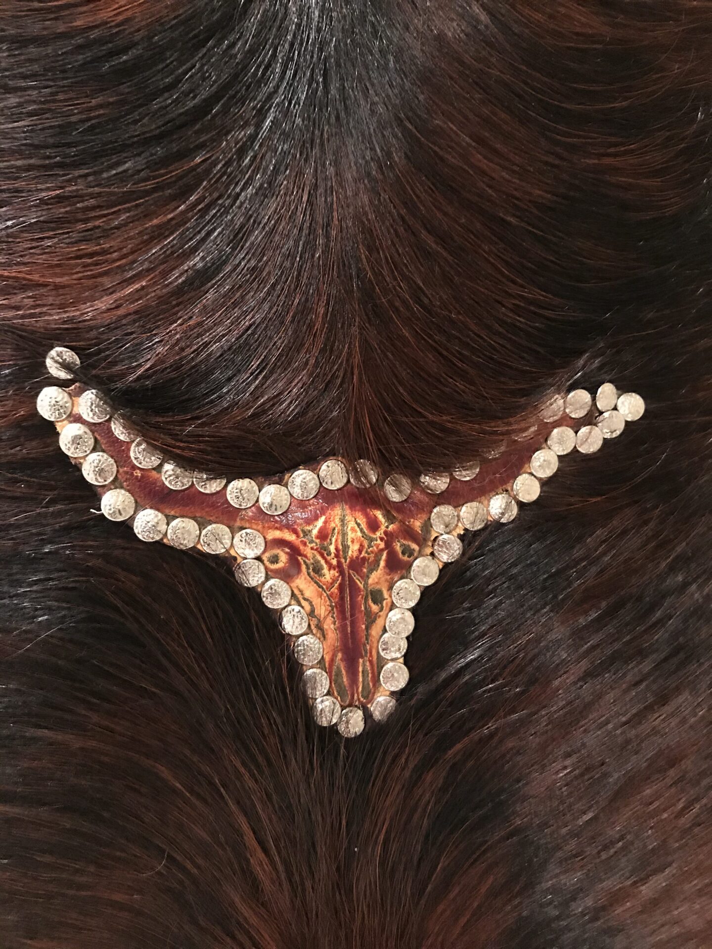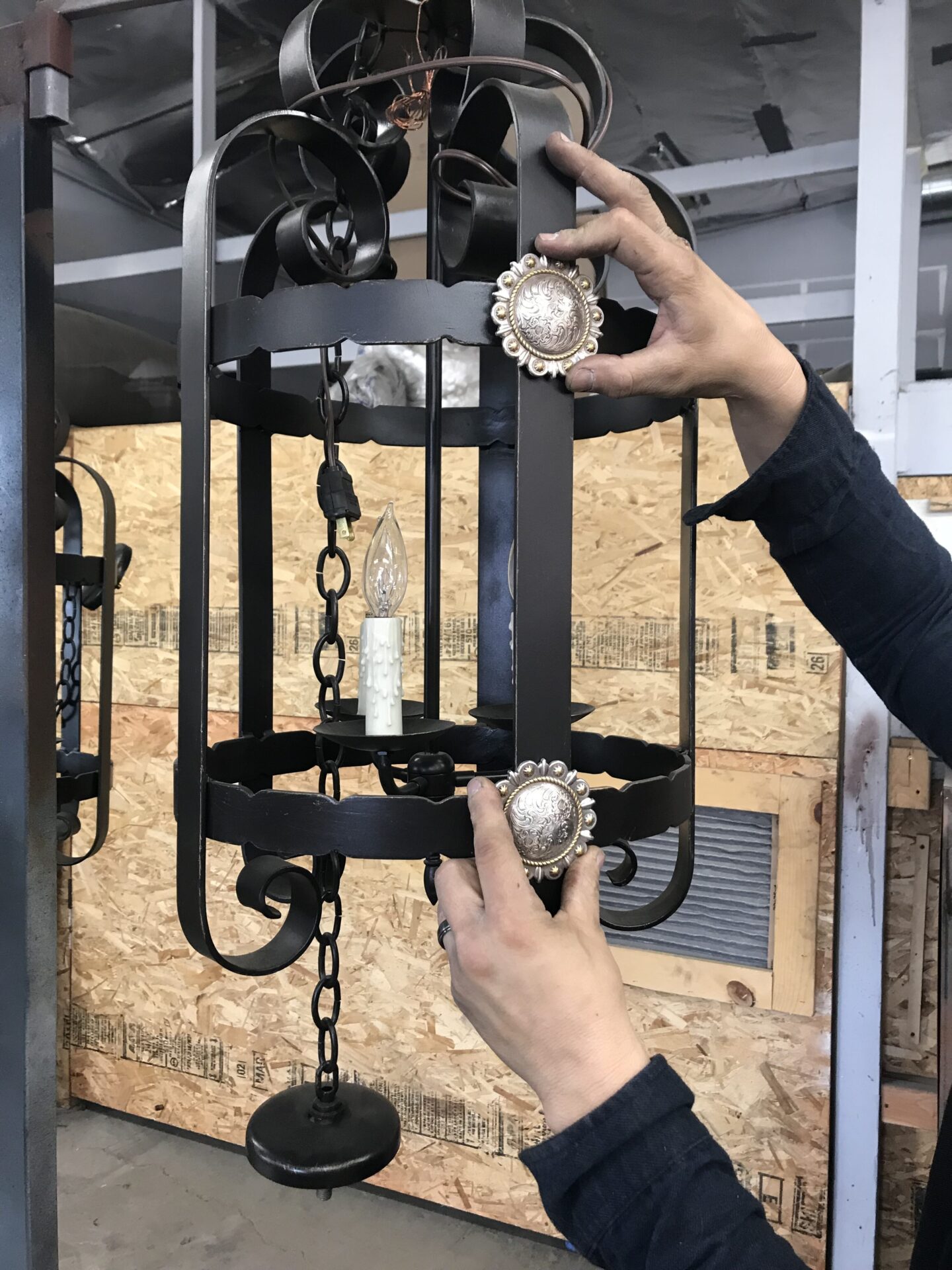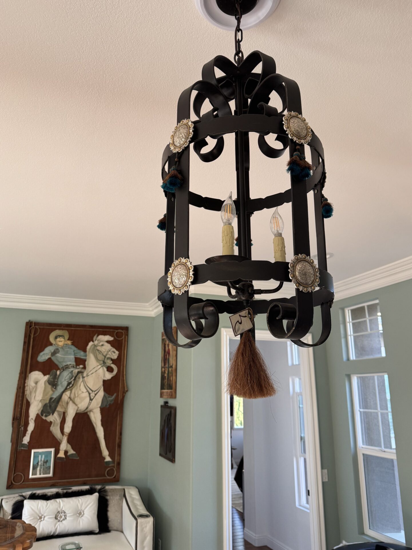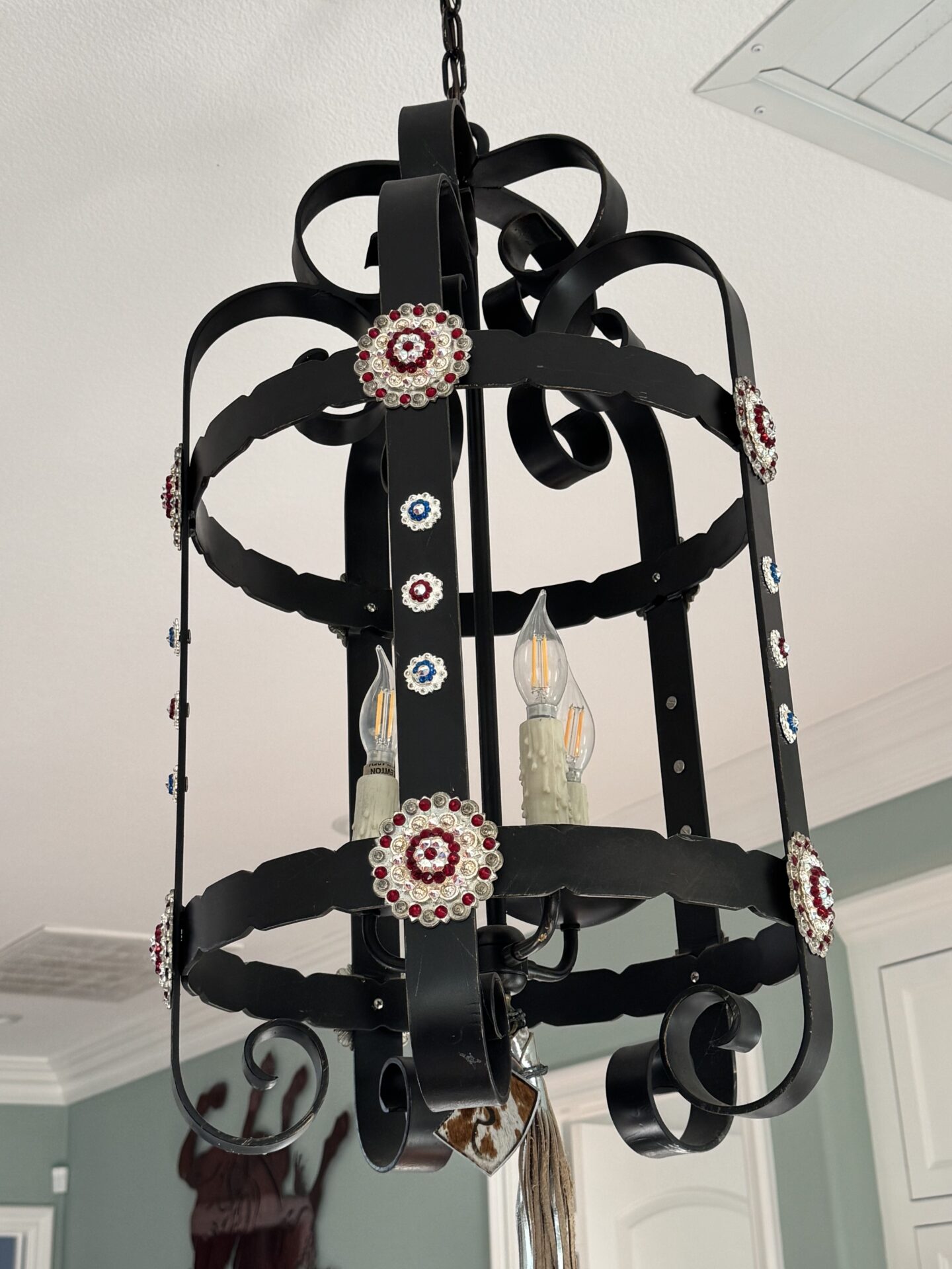 Reminiscent of a western bridle with a brow band, this chandelier design can be made shown with colored Swarovski crystal conchos or traditional silver metal conchos. Let’s design one for your home or barn in any finish or size.