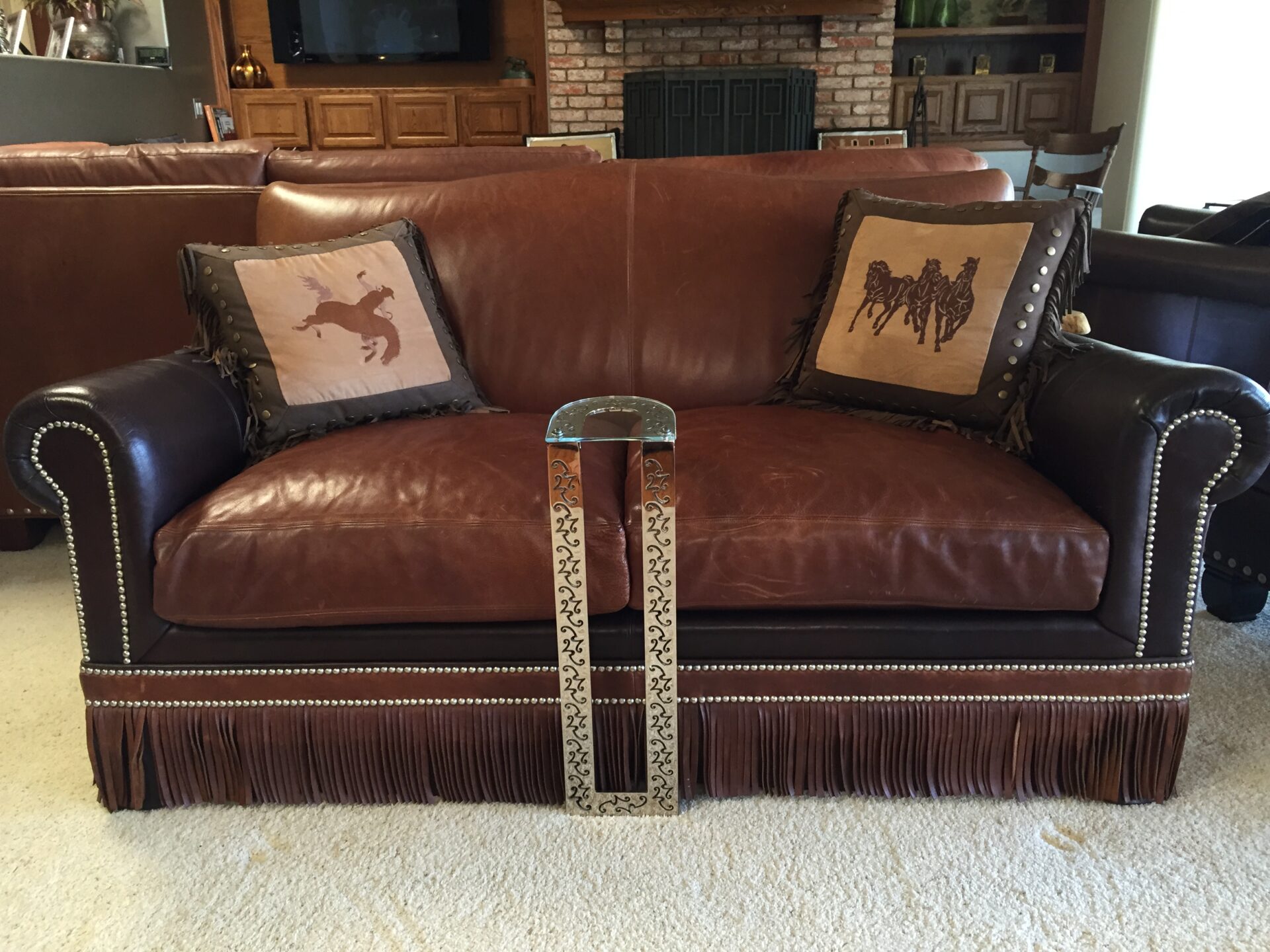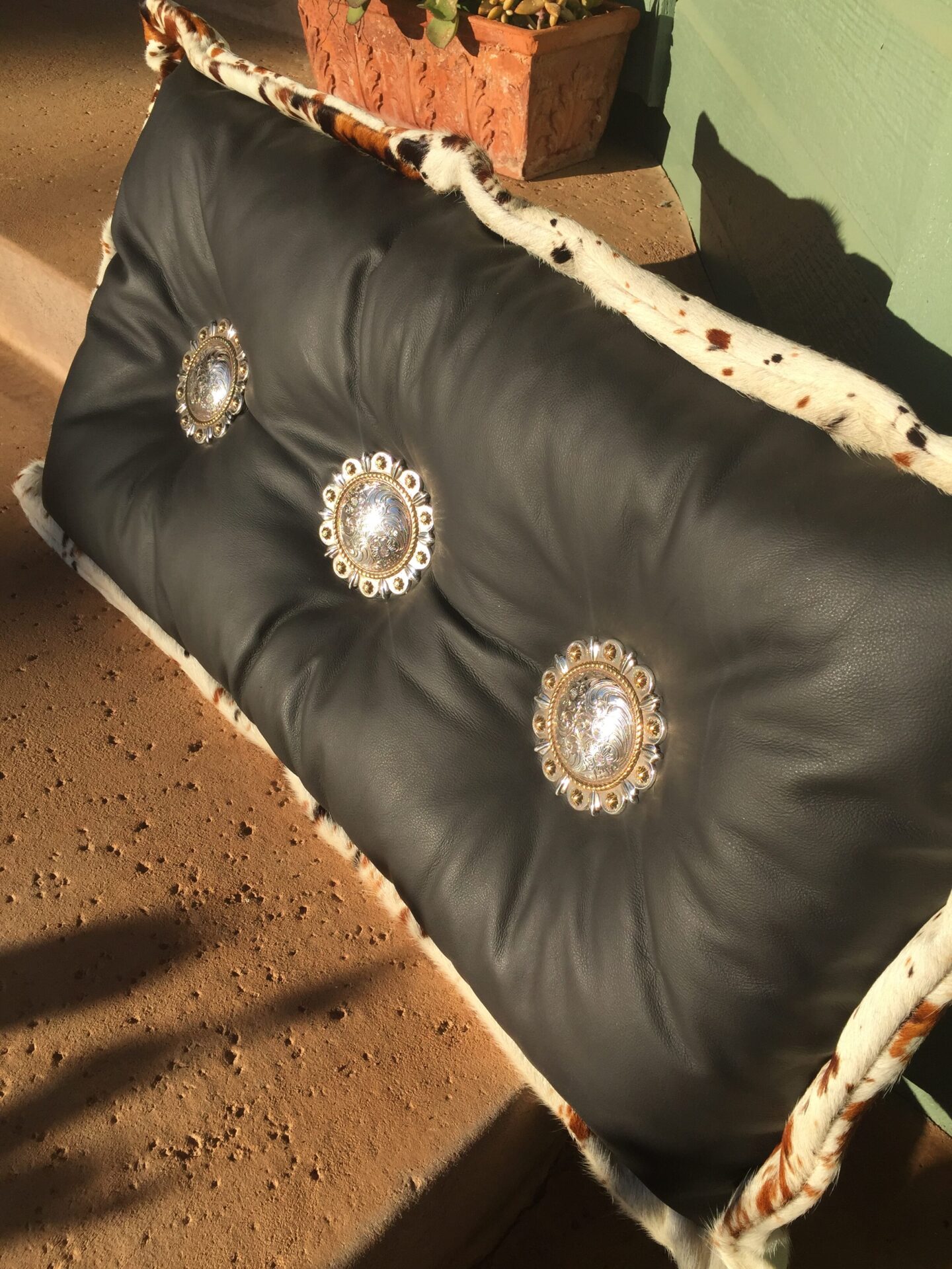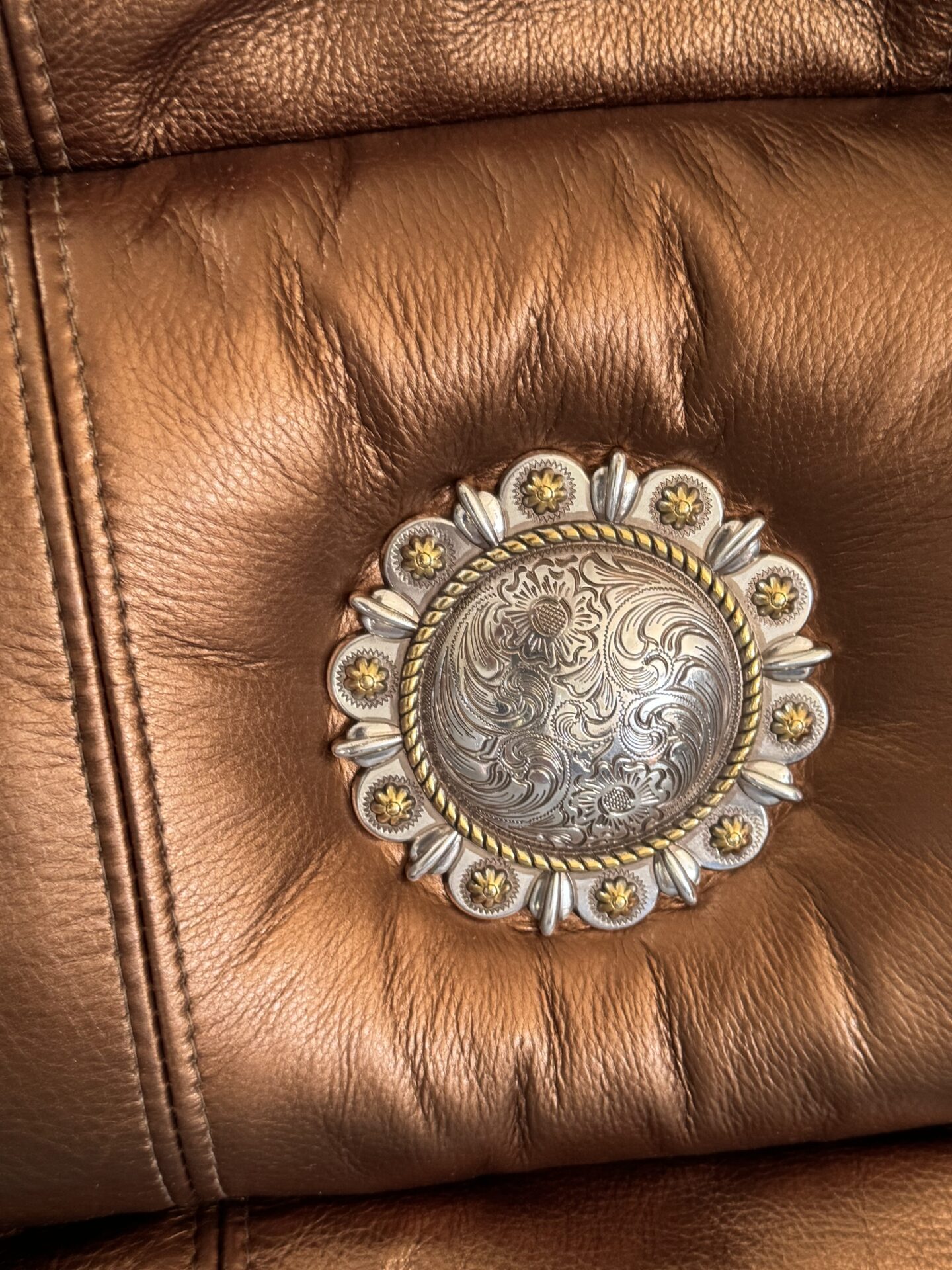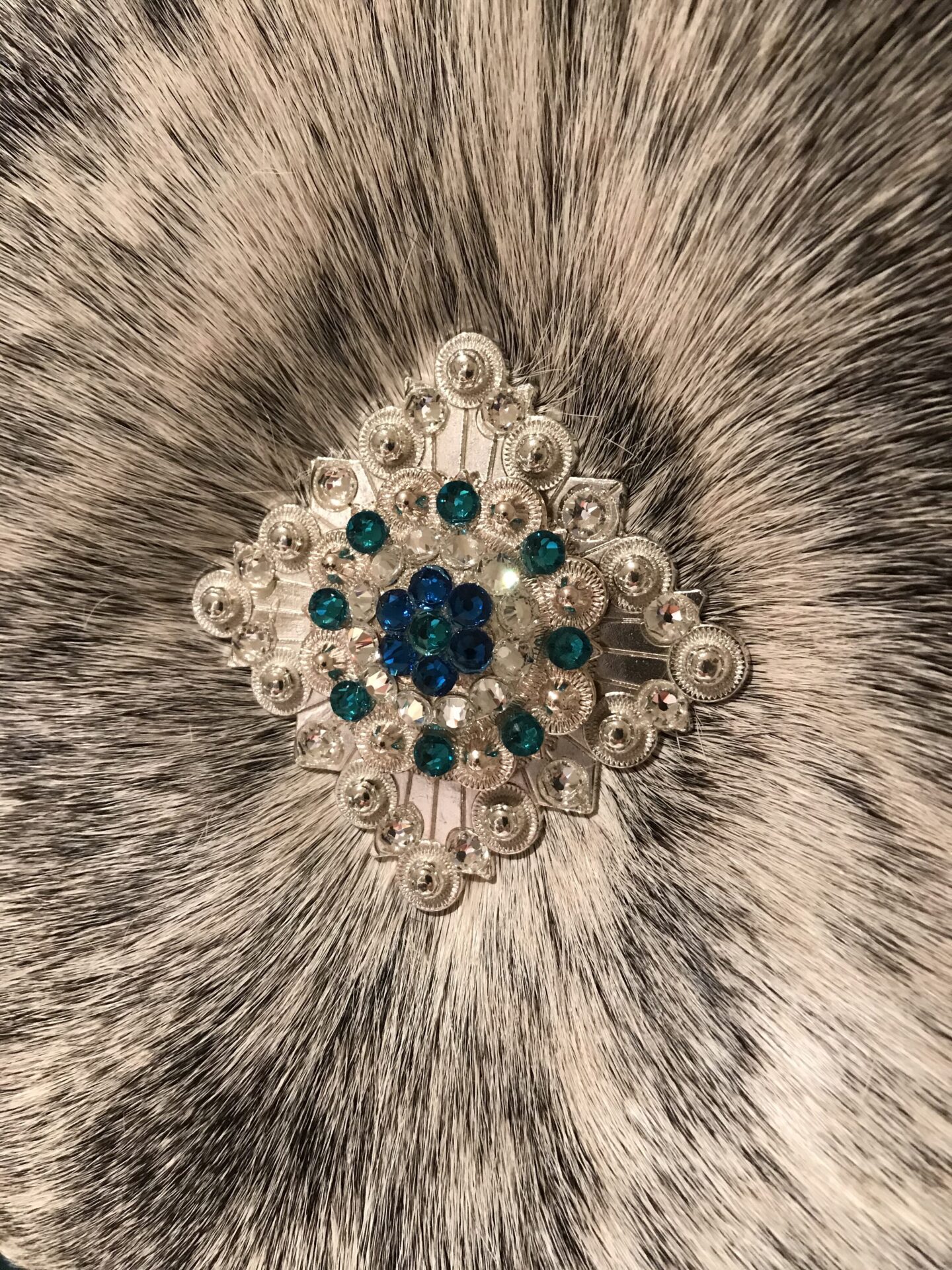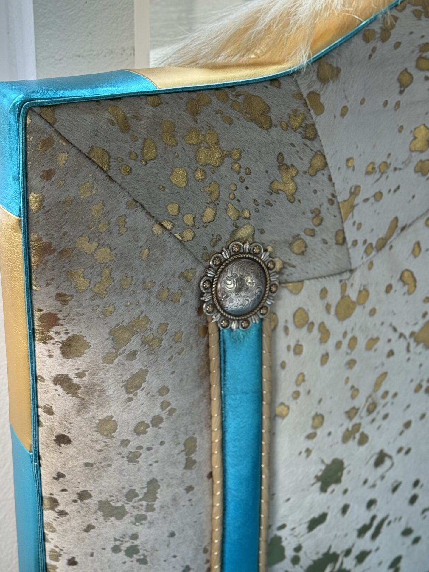 Reminiscent of a western bridle with a brow band, this chandelier design can be made shown with colored Swarovski crystal conchos or traditional silver metal conchos. Let’s design one for your home or barn in any finish or size.