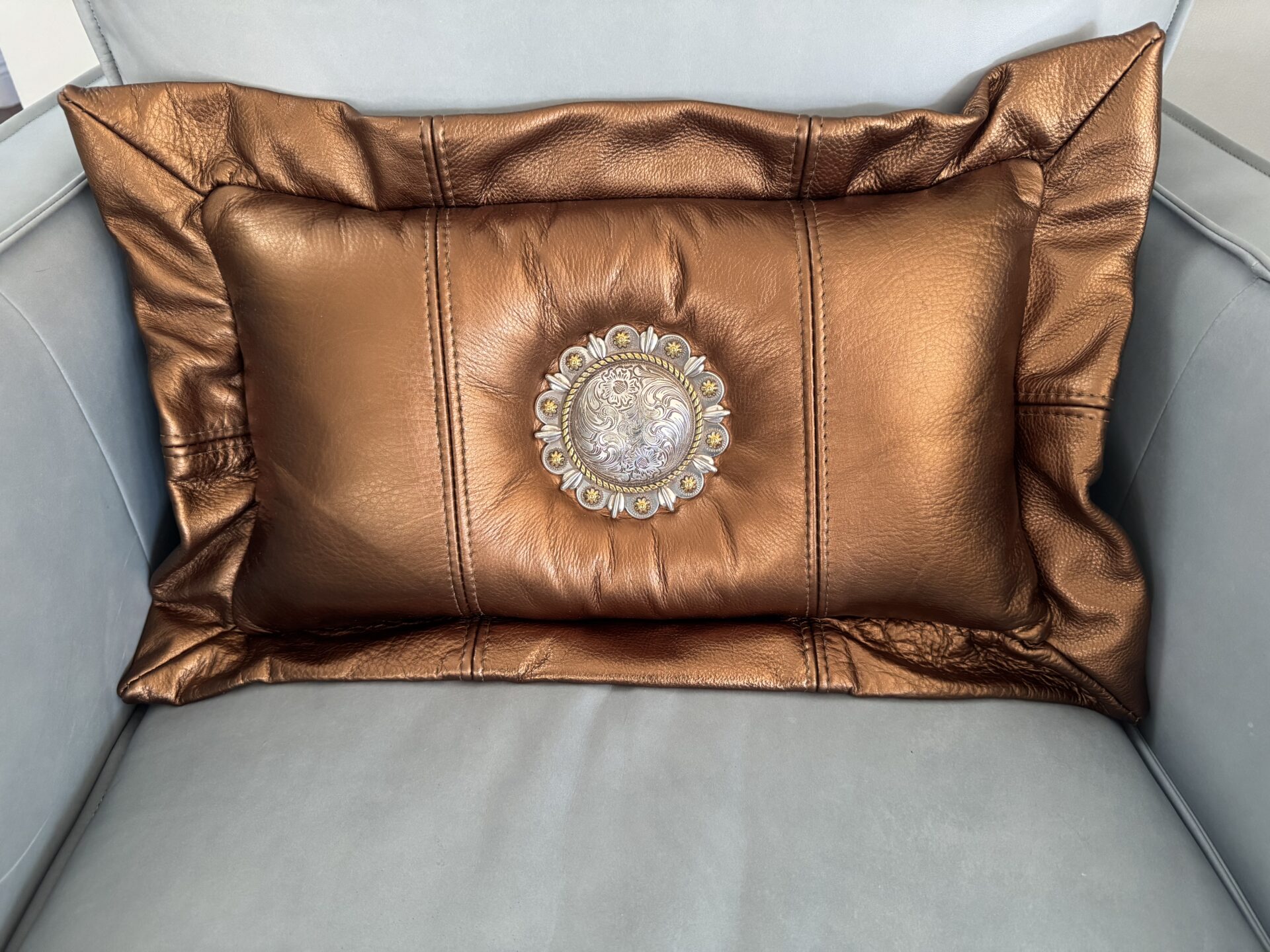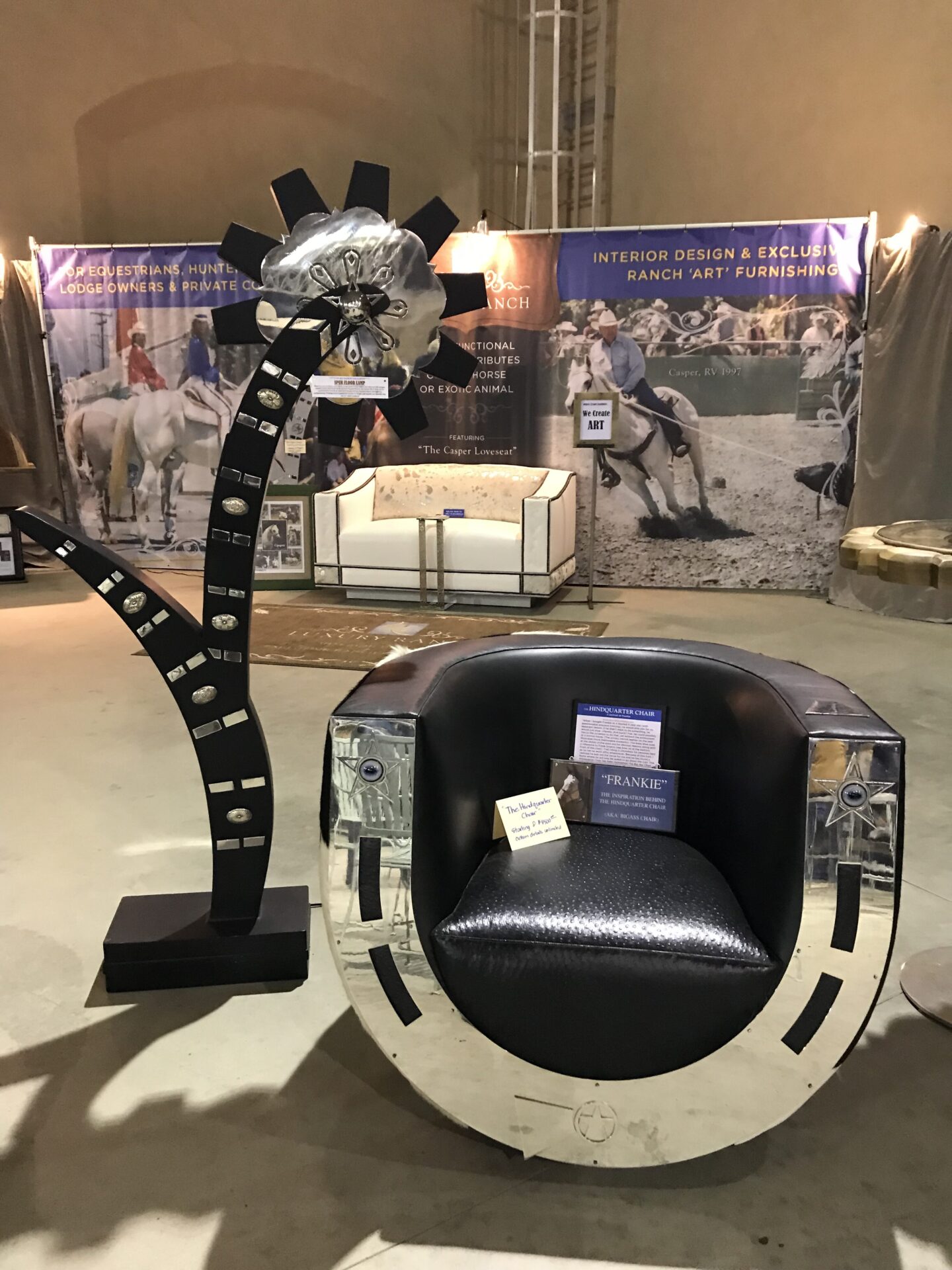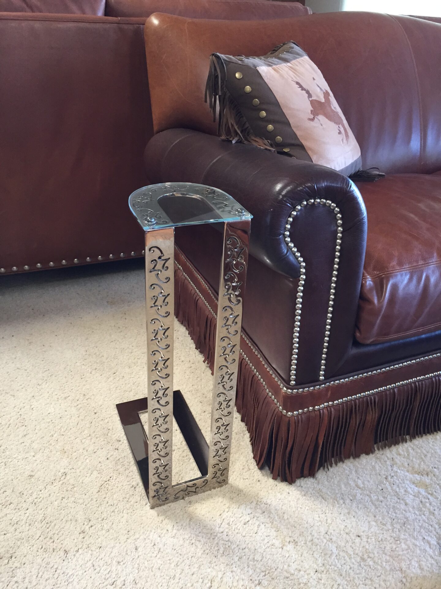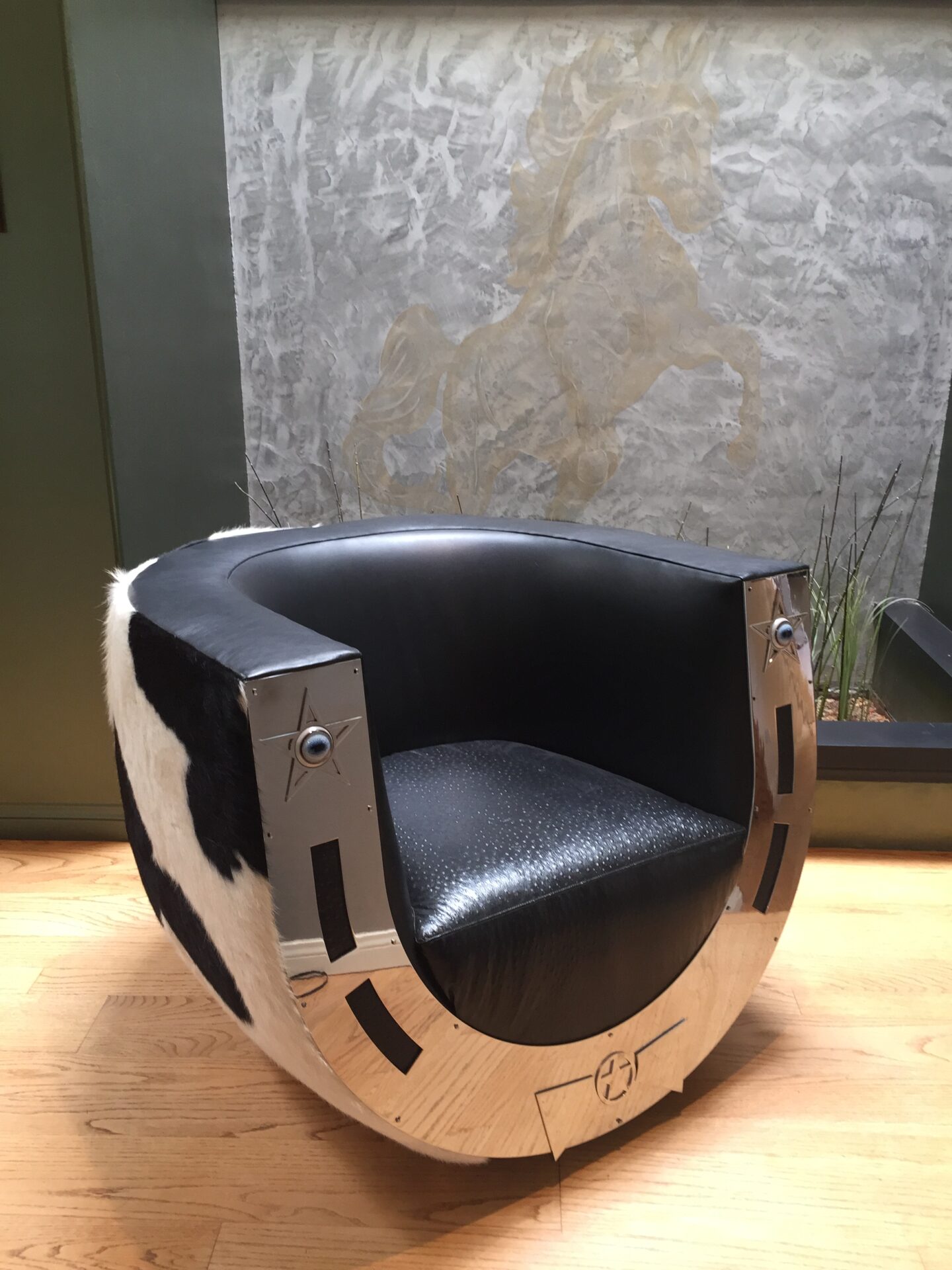 Reminiscent of a western bridle with a brow band, this chandelier design can be made shown with colored Swarovski crystal conchos or traditional silver metal conchos. Let’s design one for your home or barn in any finish or size.