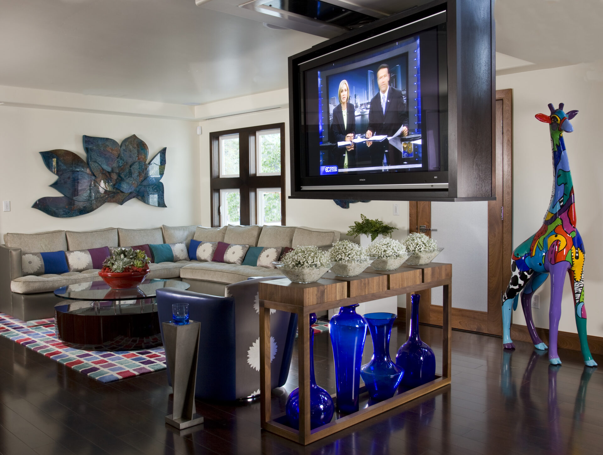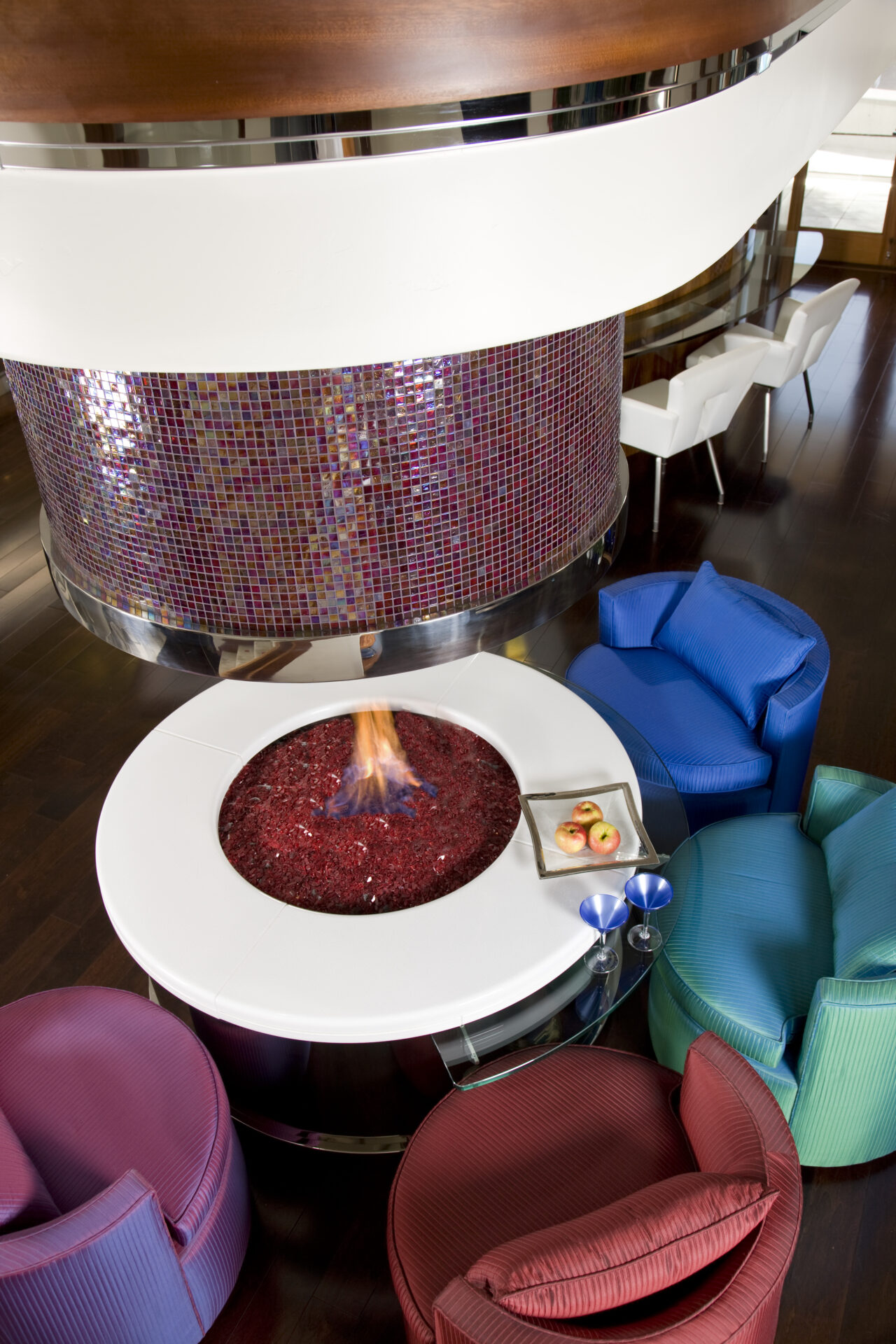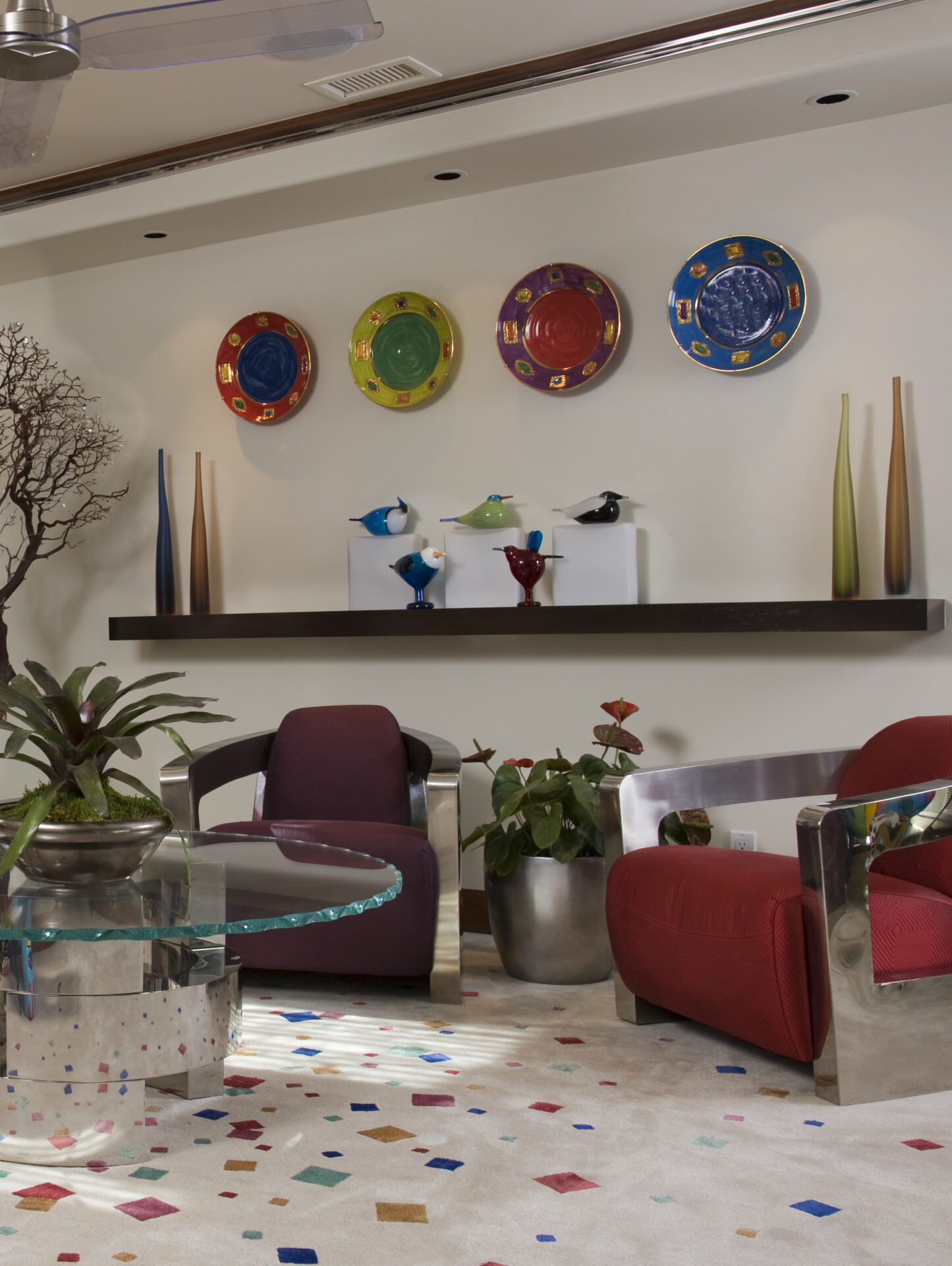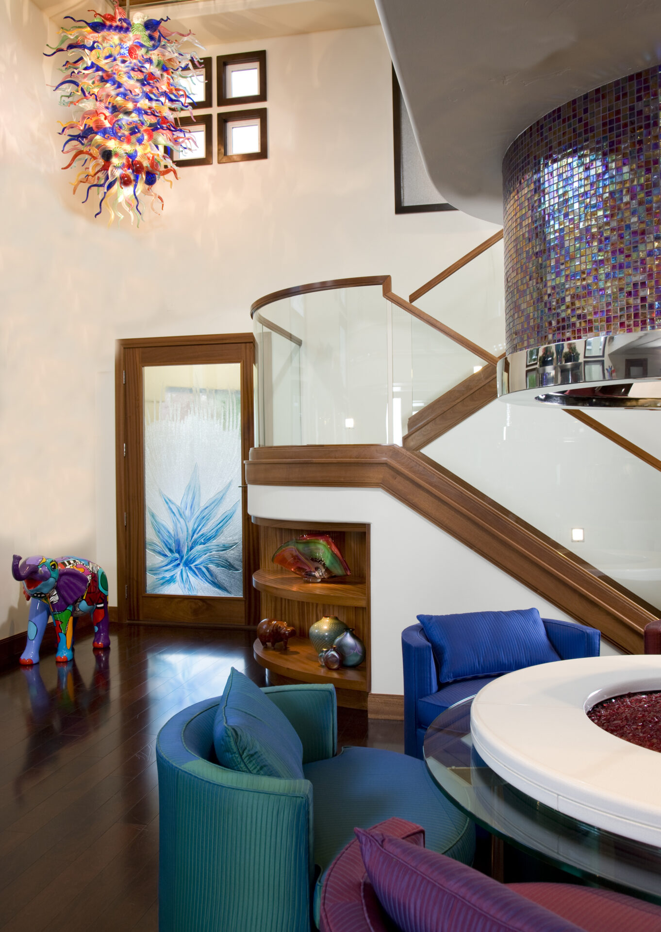 A life sized, primary-colored sculpture of a pig, and a love of cruise ship adventures became the recipe of ‘Home’ for this fun-loving couple. A downstairs bedroom was sacrificed for unhindered entertainment space, and a mahogany lined elevator became a necessity for this ‘Forever Home’
