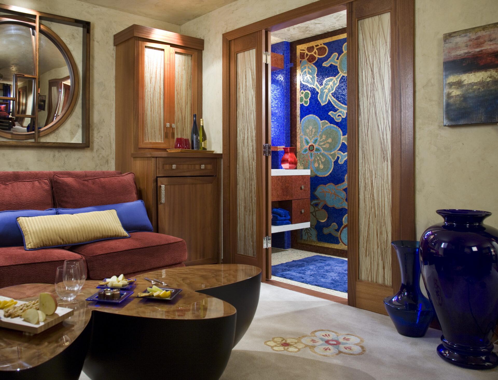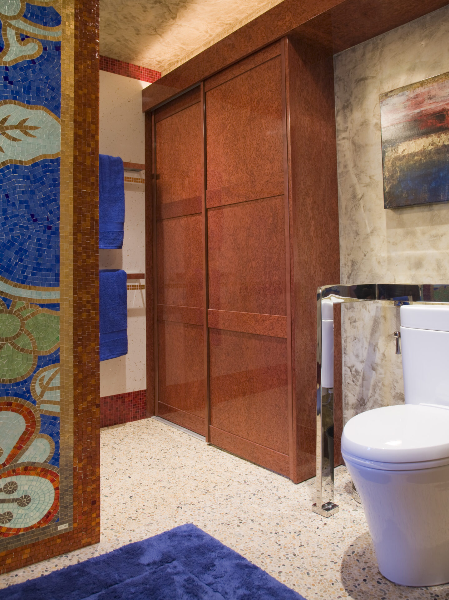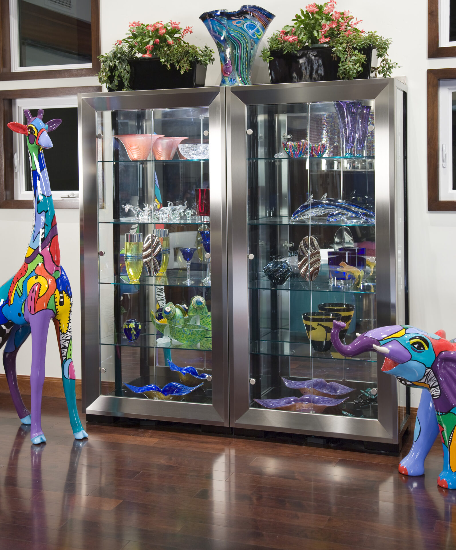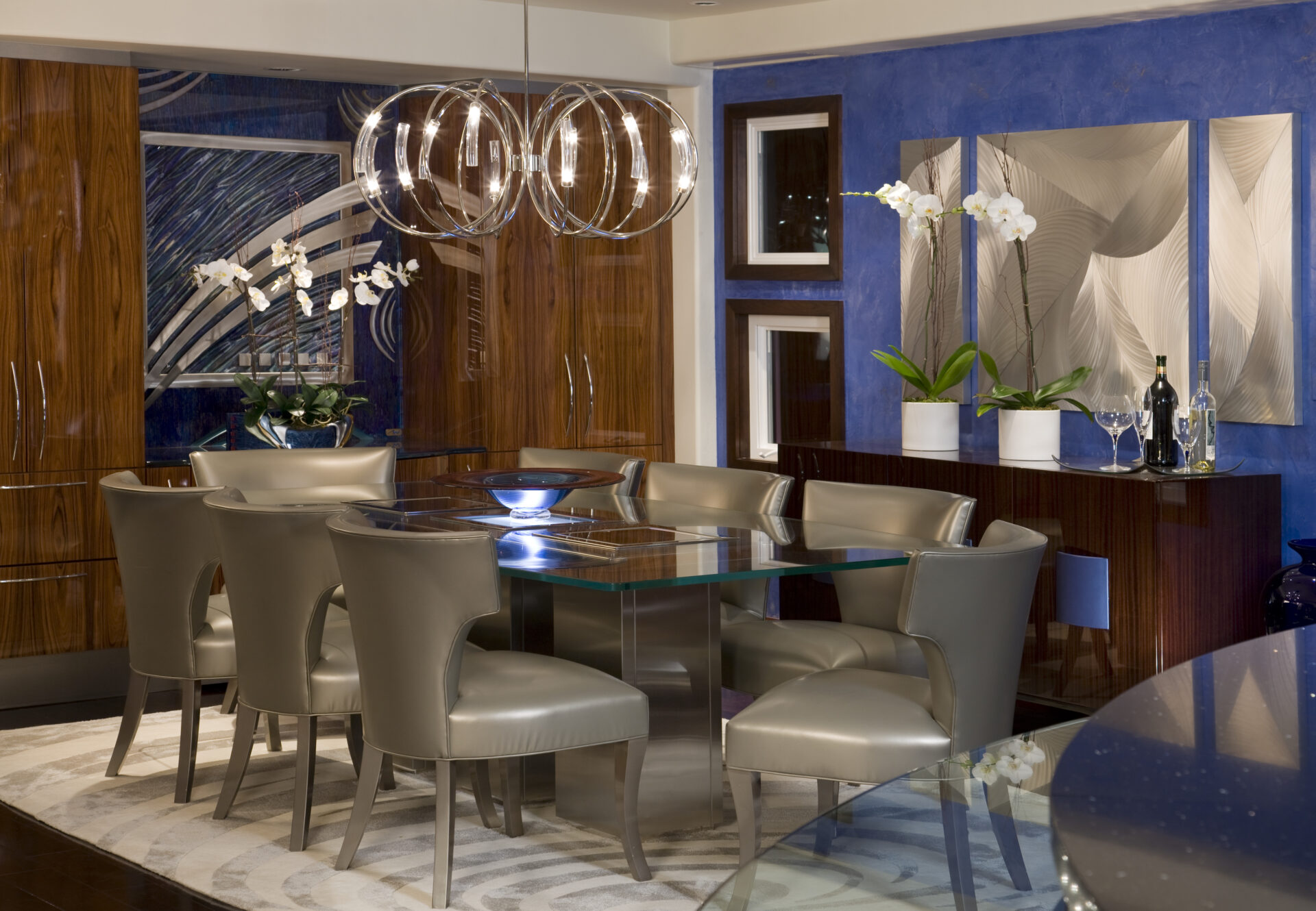 A life sized, primary-colored sculpture of a pig, and a love of cruise ship adventures became the recipe of ‘Home’ for this fun-loving couple. A downstairs bedroom was sacrificed for unhindered entertainment space, and a mahogany lined elevator became a necessity for this ‘Forever Home’